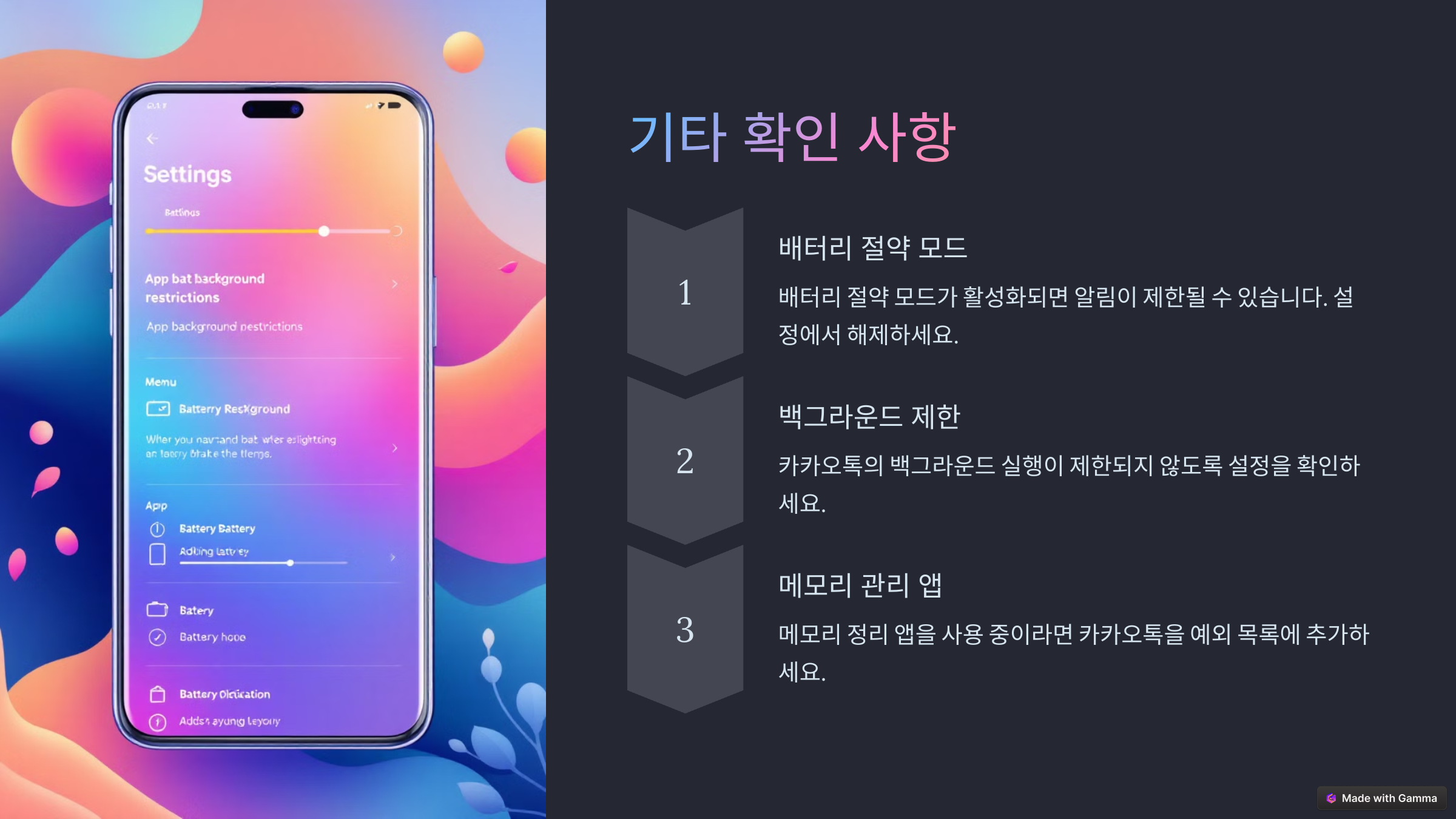 카카오톡 앱 자체는 알림을 허용하고 있어도, 스마트폰 설정에서 제한되어 있다면 소리가 들리지 않을 수 있습니다.