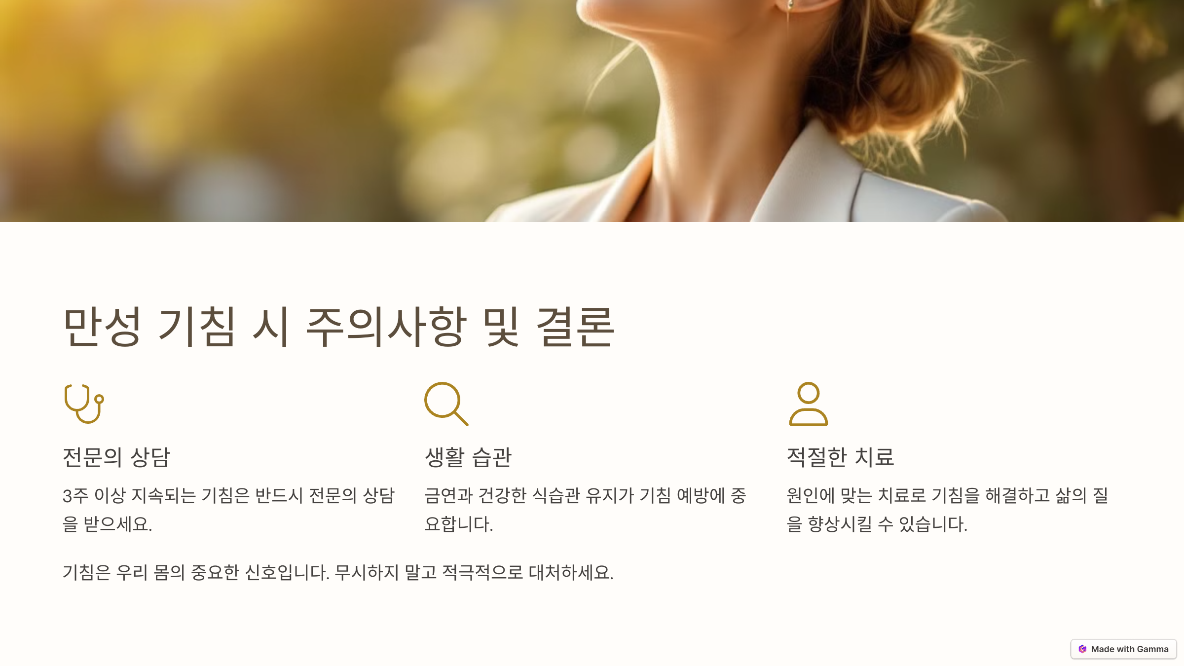 지금도 기침이 멈추지 않는다면, 환경을 점검하고 위의 해결법을 적용해보세요. 그리고 필요할 경우 전문가의 도움을 받는 것이 가장 안전한 방법입니다.