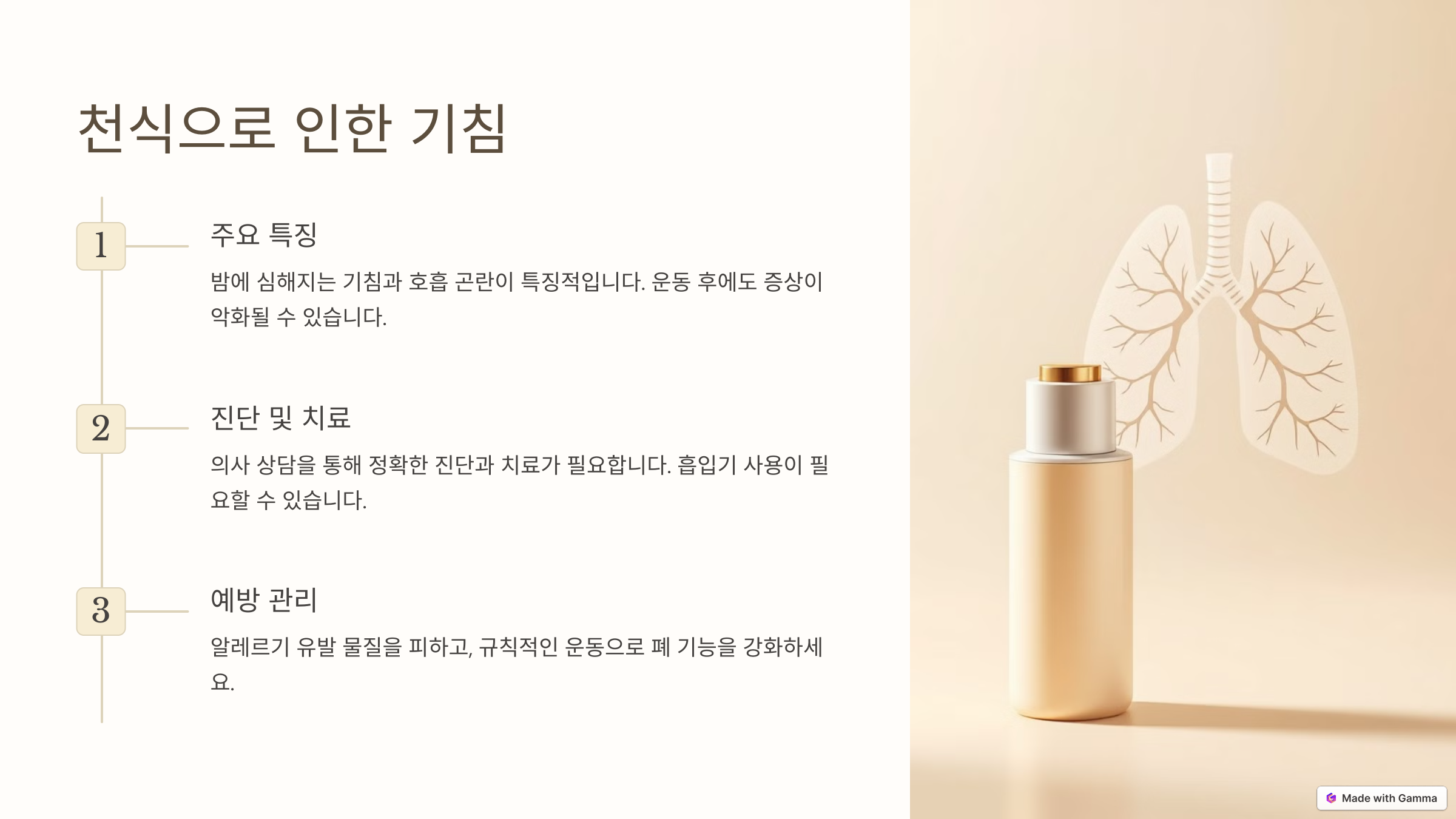 - 천식이 의심되면 알레르기 유발 요인을 피하고, 필요하면 의사와 상담해 흡입 스테로이드나 기관지 확장제를 사용합니다.