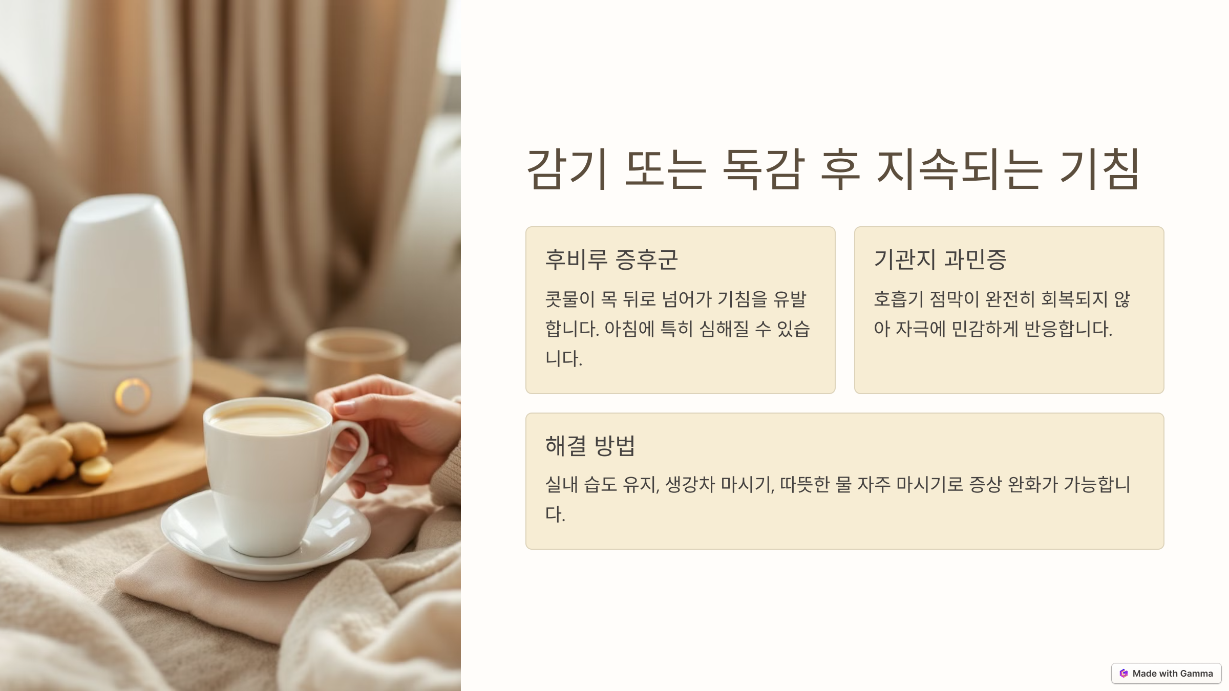 - 생강차, 도라지차 같은 자연 요법을 활용해 기관지를 진정시킵니다.